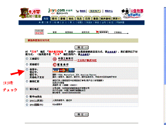 上から3番目の信用卡、借机卡、・・・にチェックし、「確定」をクリック。 この時点ではカード情報は入力しません。当然支払いも発生しません。 カード情報は一通りの注文確認が終わってから入力画面がでてきます。