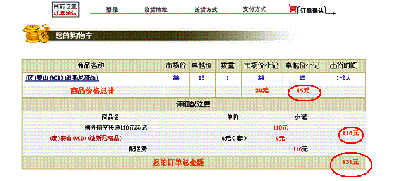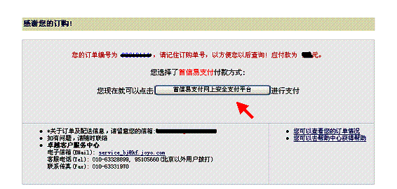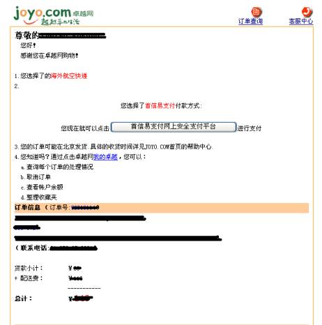 您选择了首信易支付付款方式: 您现在就可以点击「首信易支付网上安全支付平台」进行支付。 (日本語) お客様の注文書番号は、xxxxxxxxです。注文書についてのご質問などの際に必要ですので、注文書番号を控えておいて下さい。お支払金額はxxx人民元です。 お客様は首信易でのお支払をご希望されました。 こちらの「首信易安全オンライン支払プラットフォーム」よりお支払頂けます。 この時点で、同じような内容がメールでも届く。これでひとまず注文が完了。しかし、支払い(クレジットカード番号の入力)をしていないので、これだけでは発送されない。 下記はメールで来たもの。