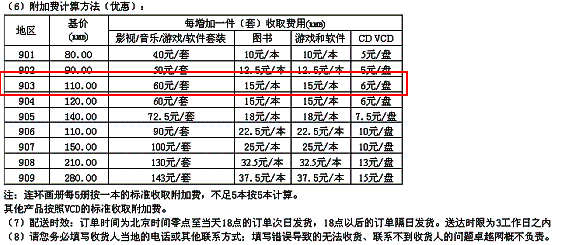 送料について 下記内容は2005年の情報です。最新はAmazon.cnのHPで直接確認してください。→2008年送料 送料は日本へ送る場合、買い物一回ごとに基本となる料金が設定されている。 下記の料金表の地区903が日本への送料表。